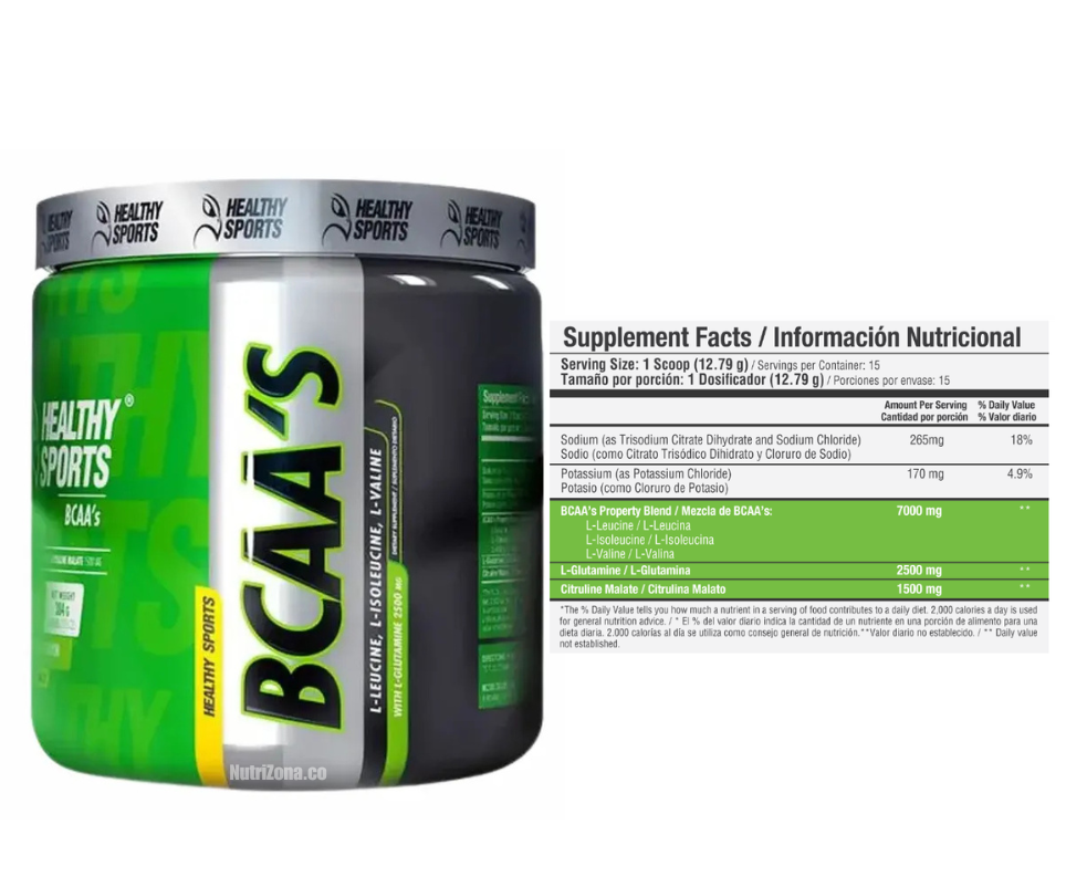 BCAA’s 7000 mg de Healthy Sports es un suplemento formulado con aminoácidos de cadena ramificada: L-leucina, L-isoleucina y L-valina, esenciales para el soporte muscular durante el ejercicio.